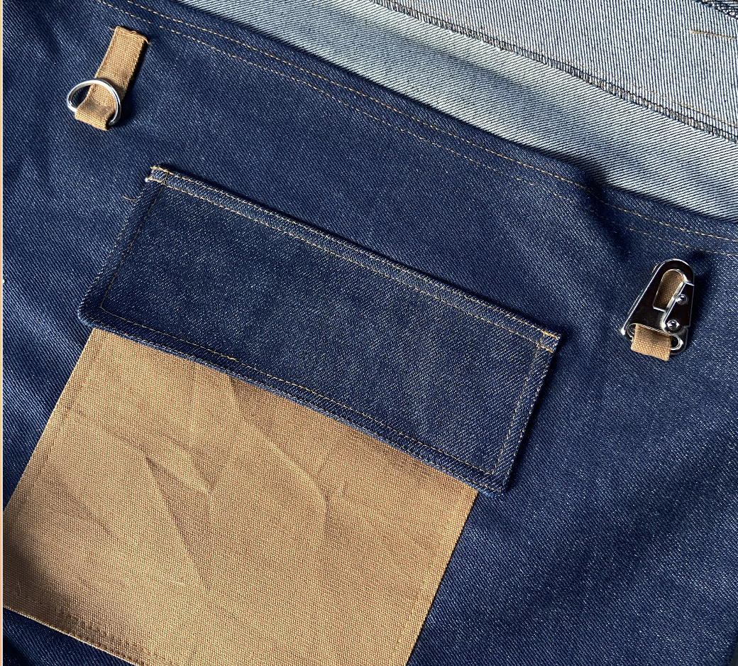Bolsa de mano color oro en loneta gruesa y detalles en mezclilla.