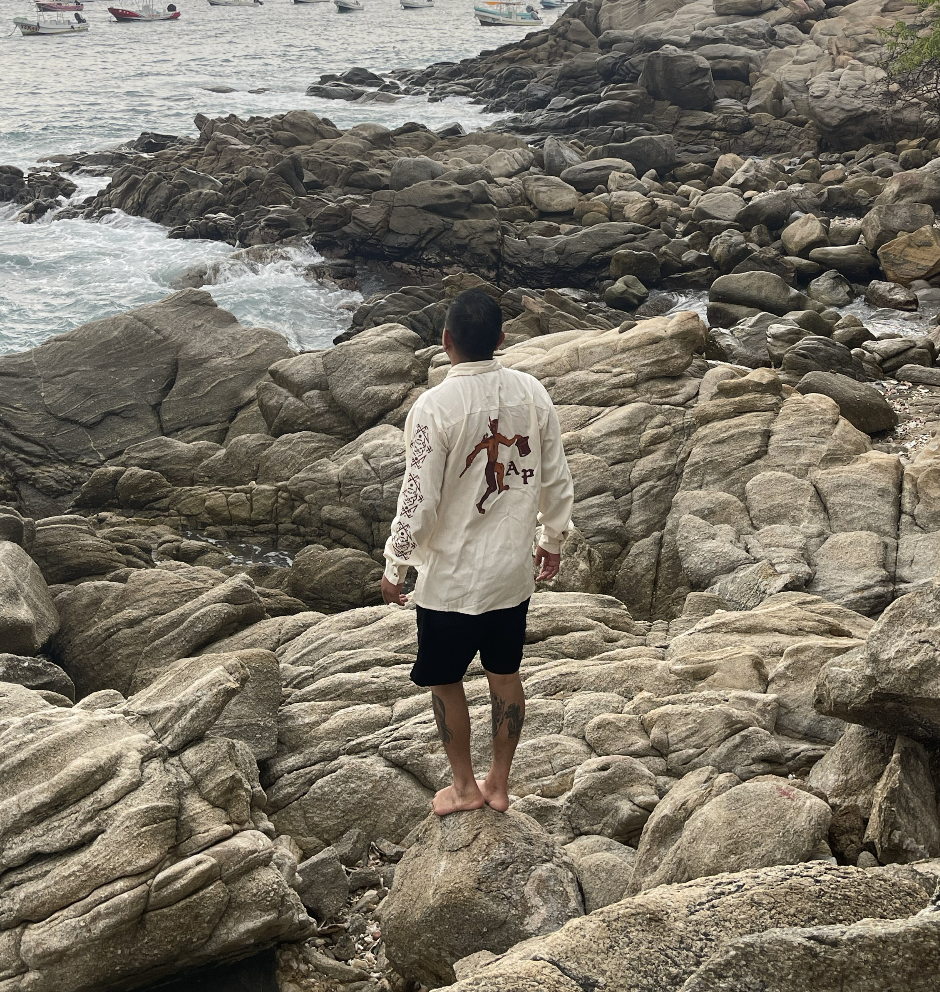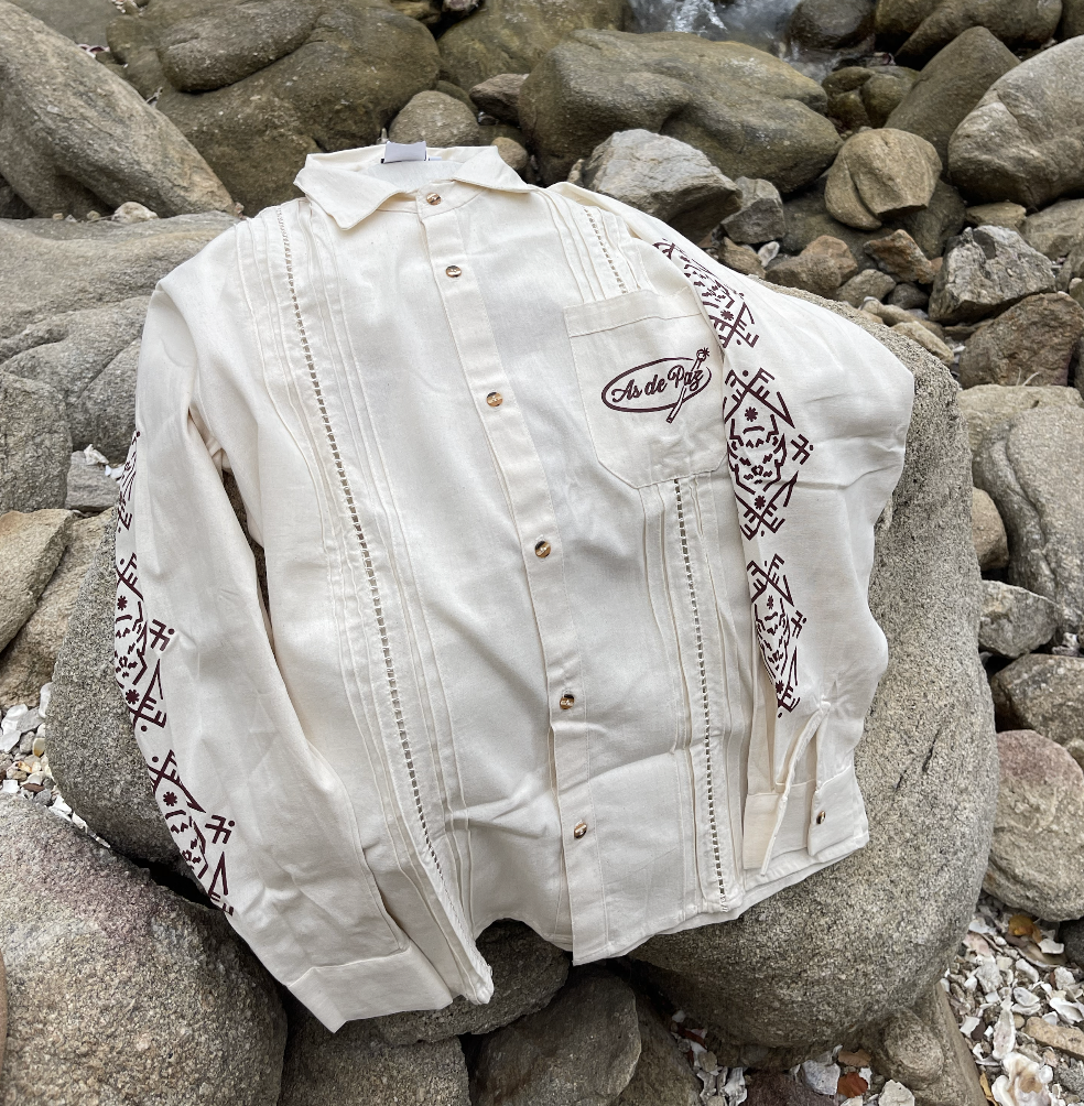 Guayabera de algodón color crudo. Con bolsillo al frente, botones café con negra, serigrafía en la espalda, mangas y bolsillo